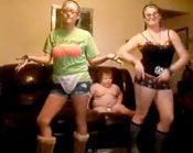 Dos hermanas bailando y el niño gordo en el sofá