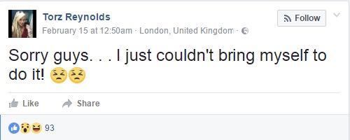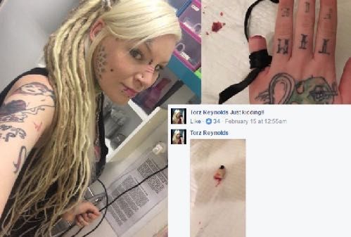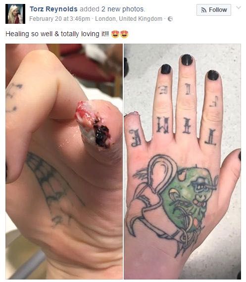 A Torz Reynolds, una mujer británica de 30 años, se le ocurrió cortarse el dedo meñique porque le apetecía y le pareció que quedaba bien. Tras cortárselo, publicó las fotografías en Facebook donde mostraba su mano sin el dedo recibiendo, como es normal, un sin fin de comentarios tildándola de loca.