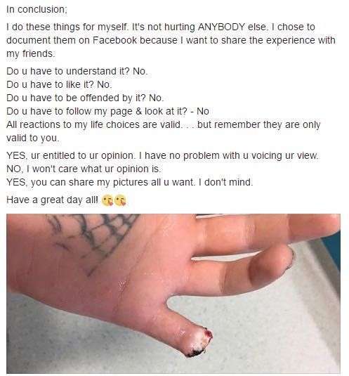Loca de 30 años se amputa un dedo por el simple hecho de publicarlo en Facebook